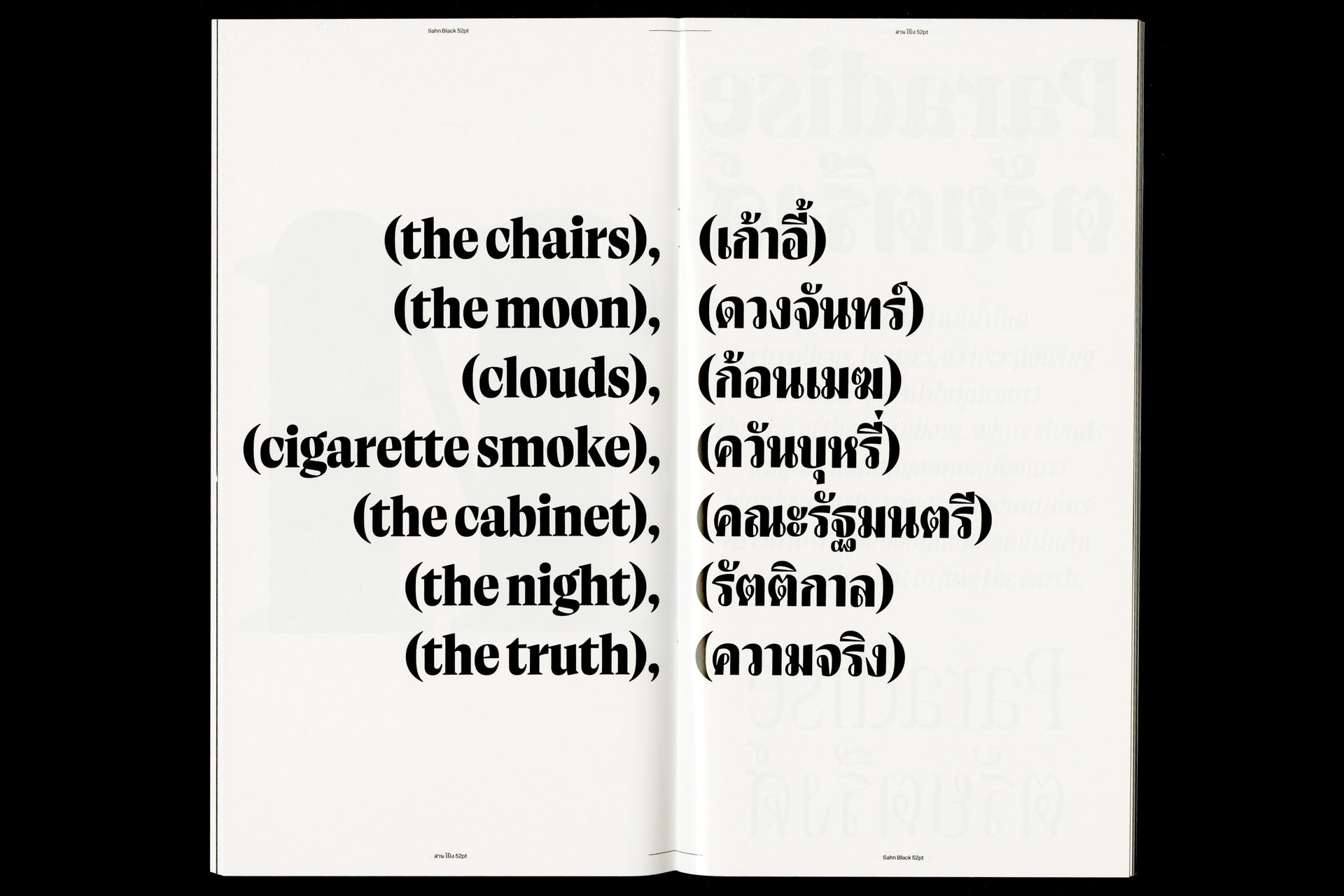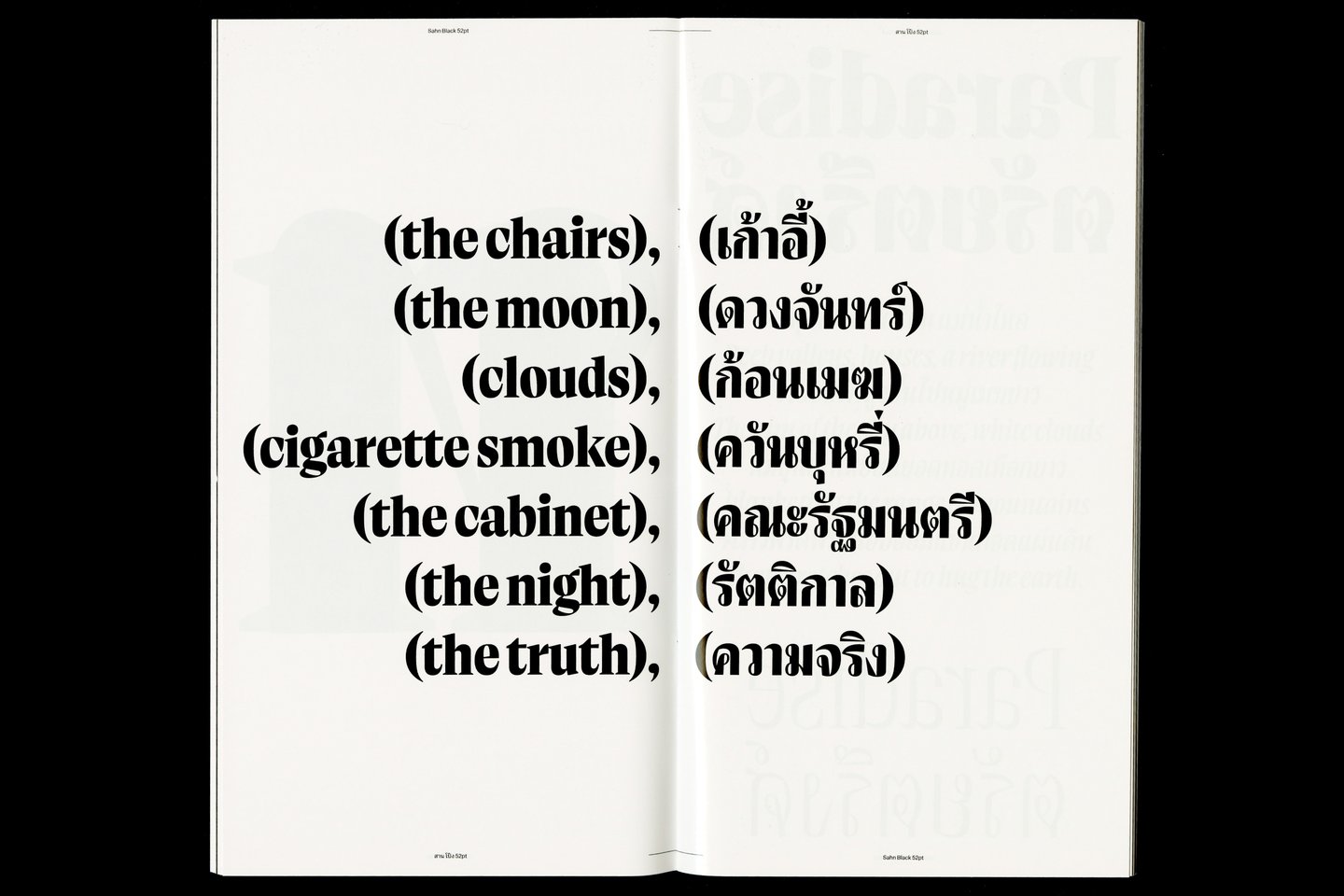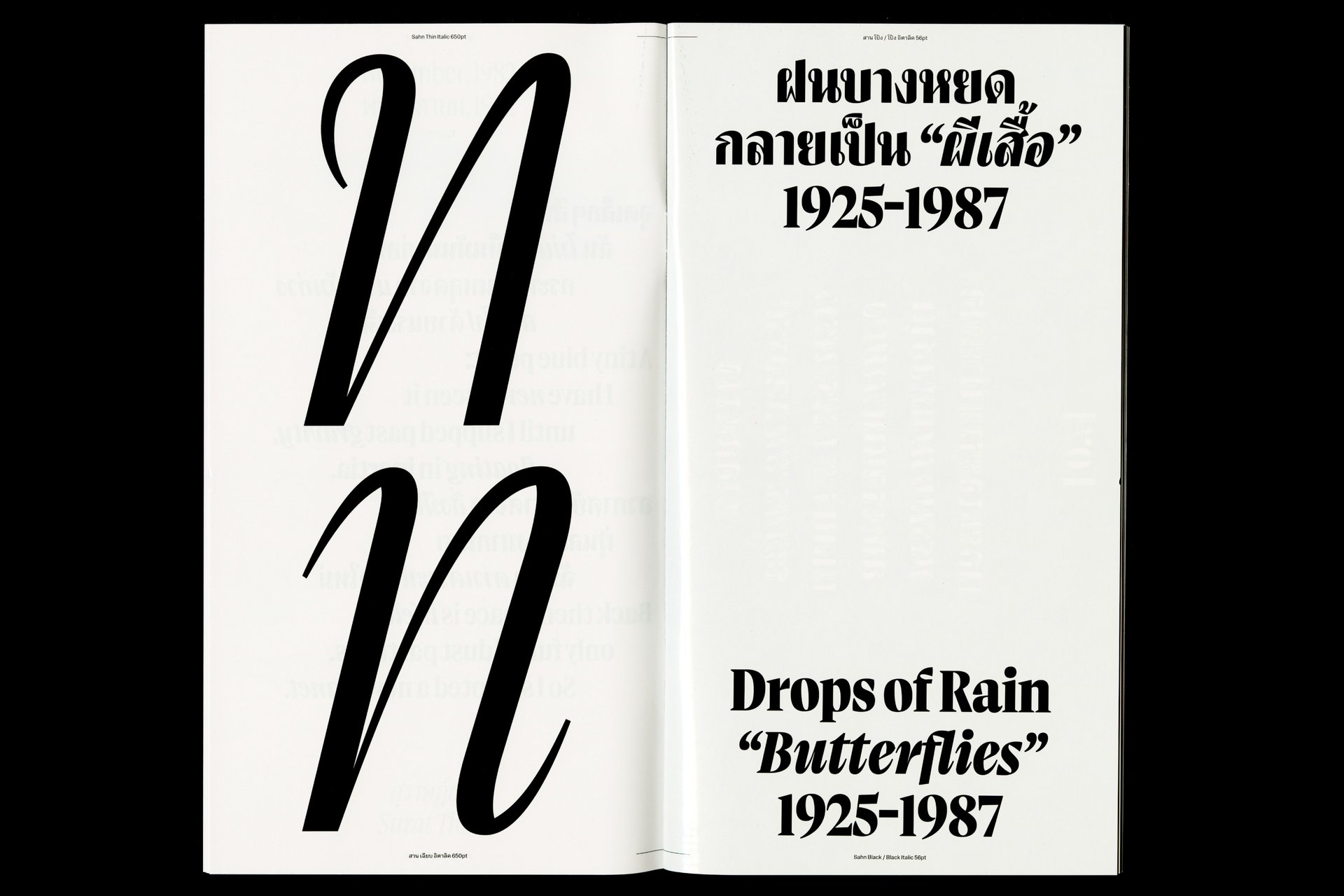 Sahn is a solemn yet flavorful typeface designed to expand the possibilities within the Thai loop typeface family. In this project, both Thai and Latin scripts were developed simultaneously. Features from one script can influence and be integrated into the other, creating a cohesive visual language. While the Thai script may appear very different from Latin, both scripts share a similar repertoire of shapes; although they are disconnected, they seek moments of connection. Sahn aims to foster a dialogue between the two scripts by highlighting their commonalities in terms of tone and texture, while honouring their unique cultural differences.