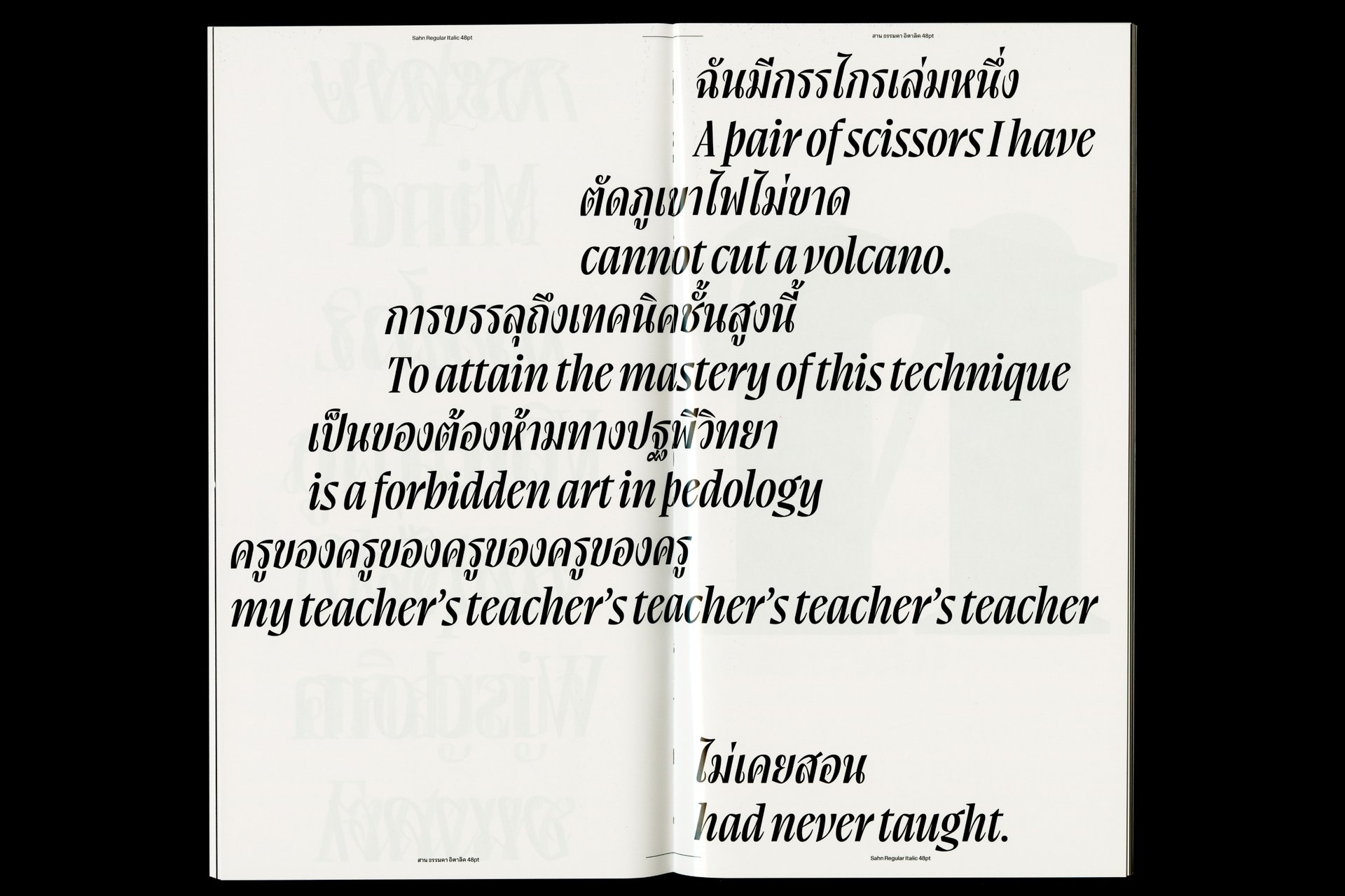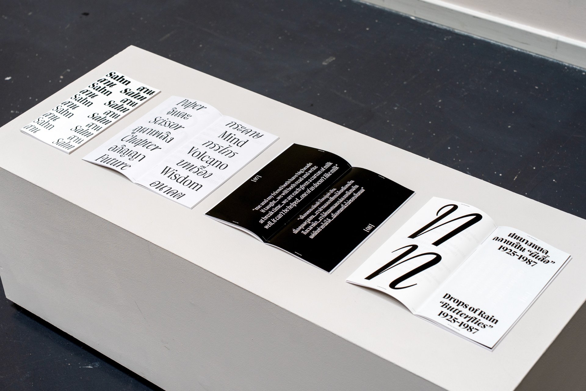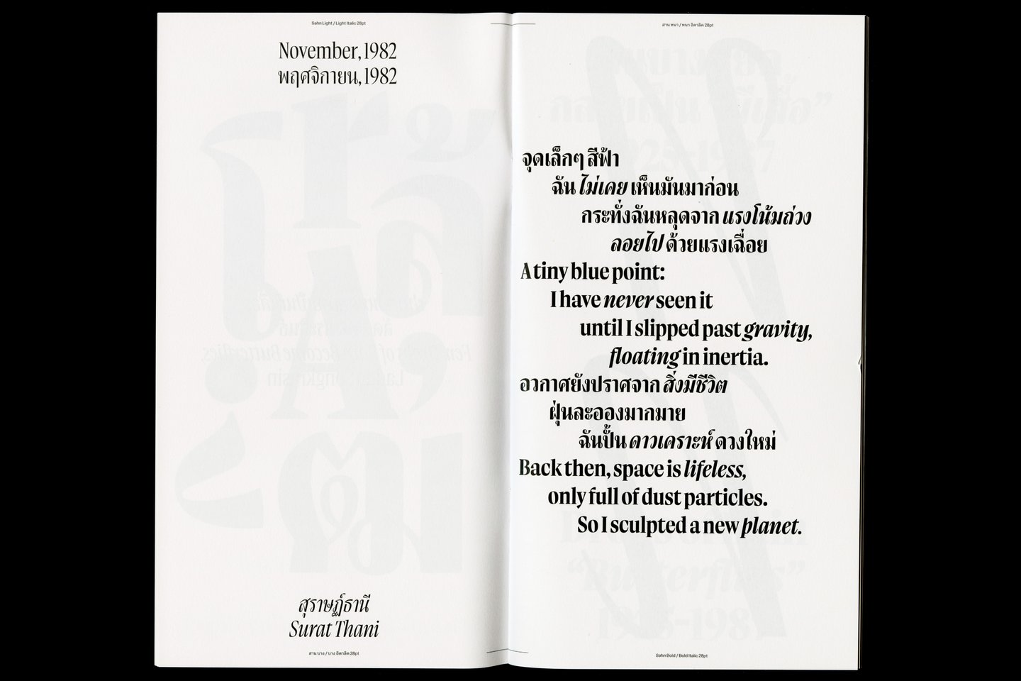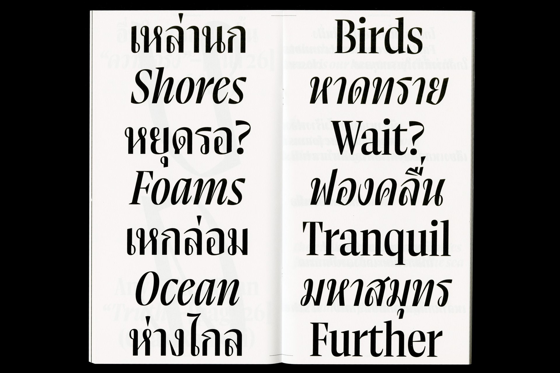 Sahn is a solemn yet flavorful typeface designed to expand the possibilities within the Thai loop typeface family. In this project, both Thai and Latin scripts were developed simultaneously. Features from one script can influence and be integrated into the other, creating a cohesive visual language. While the Thai script may appear very different from Latin, both scripts share a similar repertoire of shapes; although they are disconnected, they seek moments of connection. Sahn aims to foster a dialogue between the two scripts by highlighting their commonalities in terms of tone and texture, while honouring their unique cultural differences.