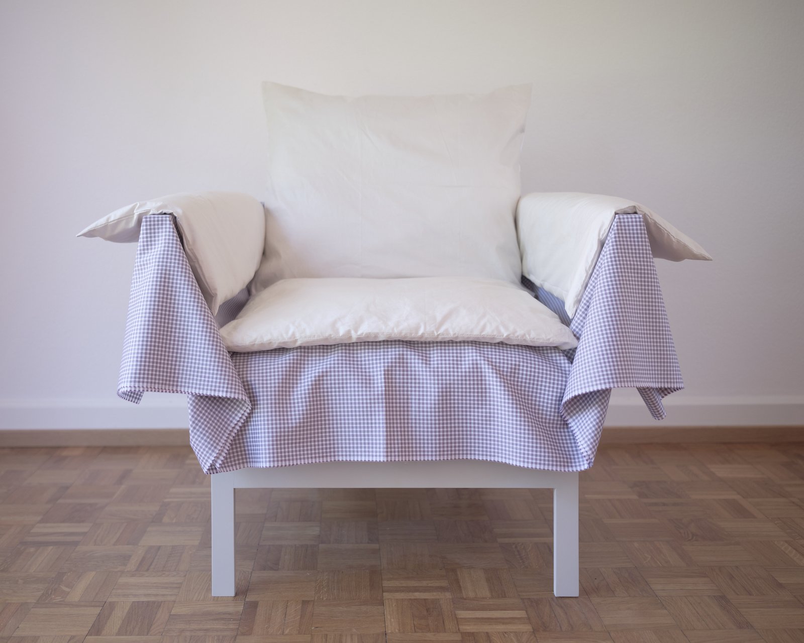 Doll Chair is a seat imagined as a body to be dressed. Each textile element is independent, buttoned onto the structure, forming a collection of interchangeable cushions. The fabric, draped rather than stretched, echoes the familiar gesture of covering a seat to hide its wear. This chair reverses traditional hierarchies: here, visible finishes become structure, and dressing becomes a ritual. Inspired by the intimate gestures of the boudoir, Doll Chair extends a reflection on the object in a state of transformation—between model and furniture.