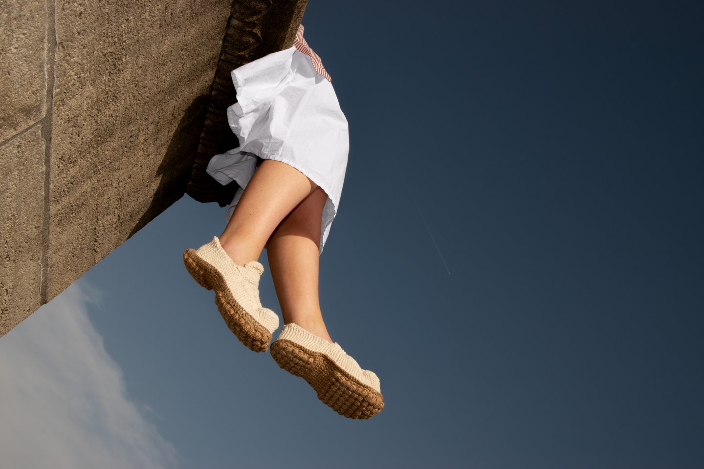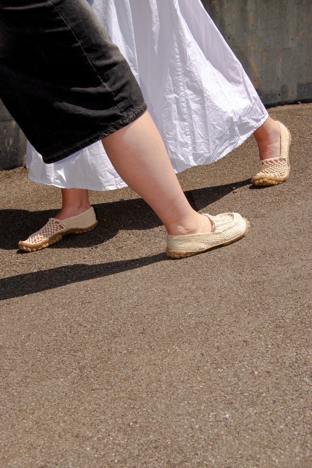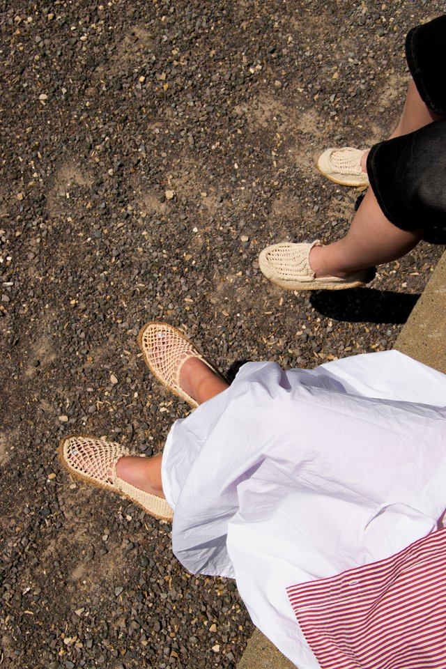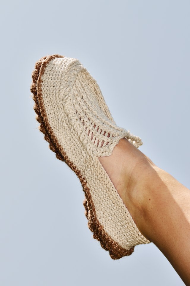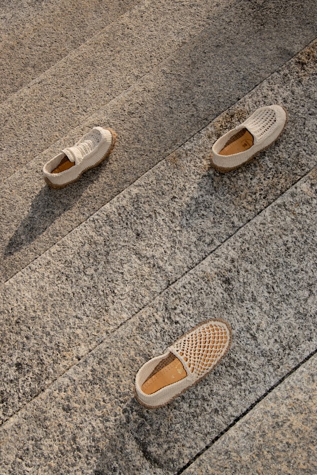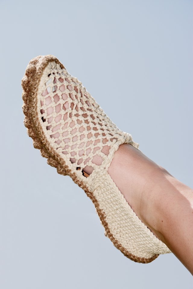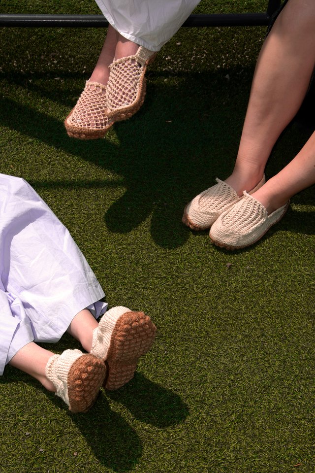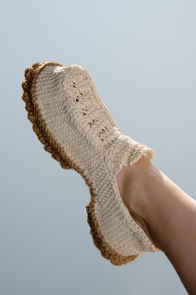 Loo is a collection of three summer shoes entirely made of knit, including the sole. The project explores the possibilities of ornamental knitting by repurposing decorative stitches to reveal their structural and functional qualities. The upper combines a dense and elastic garter stitch for support with an openwork knit that allows air to circulate, ideal for the summer season. Thanks to the bubble stitch, the jute sole gains volume, durability, and comfort. Each bubble acts like a cushion of material, and their repetition creates a textured profile. Inspired by moccasins and espadrilles, Loo blends an artisanal look with industrial production potential. Their crochet assembly allows easy disassembly, extending their lifespan and facilitating recycling.