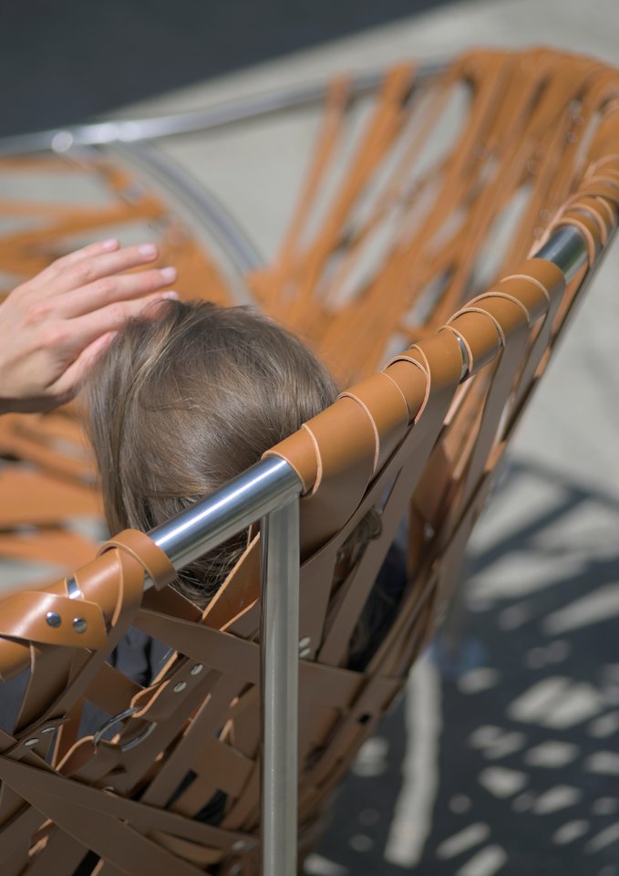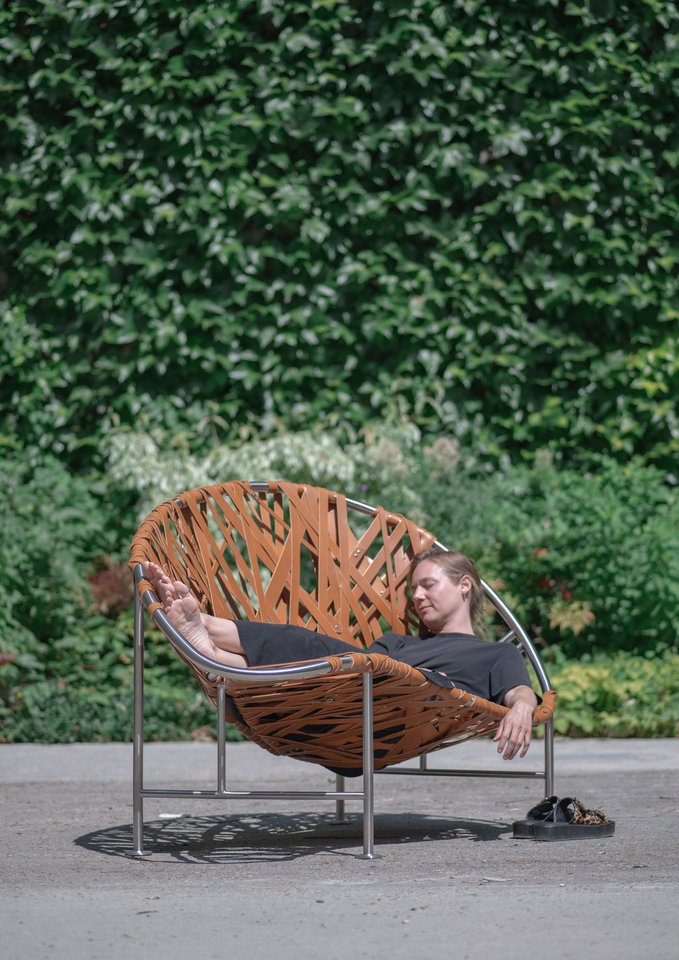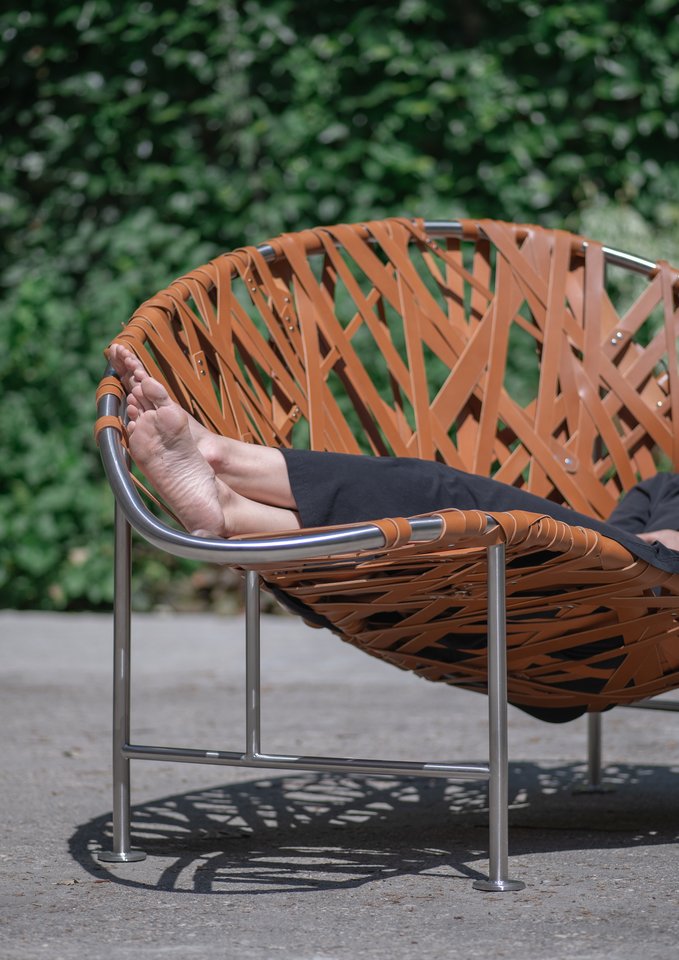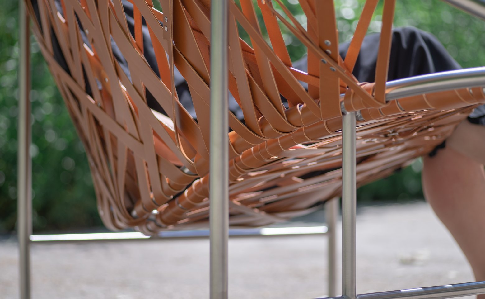 Baya is a lounge chair inspired by animal nests. Starting with the question “Why do humans need to create?”, I explored instinctive structures built by animals—nests where function and form merge, offering a pure model of creation beyond culture and ornament. Baya’s CNC-bent stainless steel frame is imagined as branches, hand-wrapped with leather strips to form a personal nest that blends industrial precision with primal gesture. Leather, used since ancient times, softens metal’s rigidity and symbolizes the deep bond between nature and humans. Its enveloping form welcomes varied postures and moments of reflection, while the reconfigurable design fosters long-term care over short use.