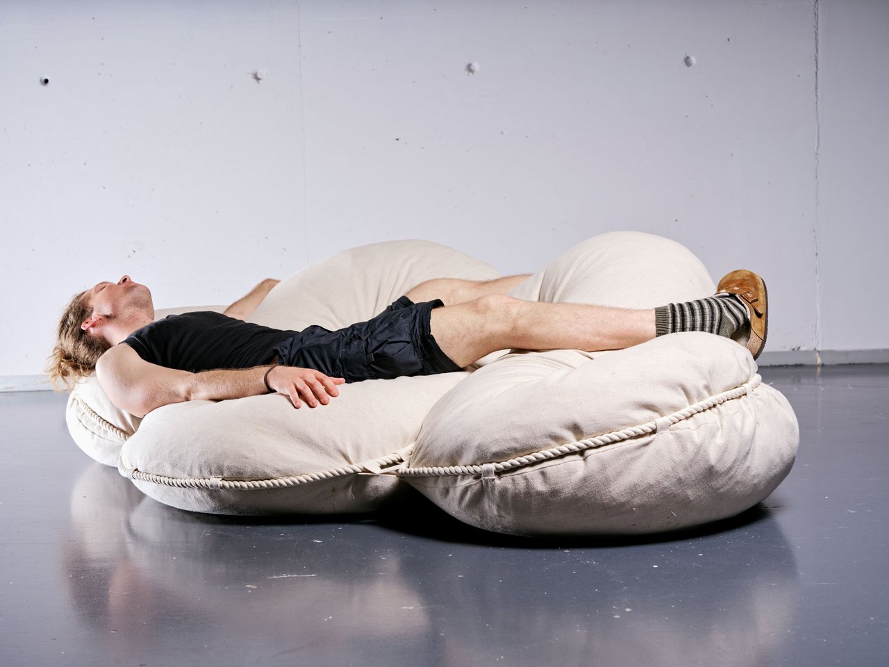 HayDay — a low-tech comfort solution: a low sofa filled with hay that embraces simplicity, sustainability, and tactile warmth. In contrast to overly complex internal constructions, it offers a refreshingly honest and charming approach to lounging. Made from just a single rope, fabric, and straw, its minimalist structure highlights the beauty of essential materials. When the rope is untied, the sofa unfolds into a daybed, adding versatility to its humble and grounded design.