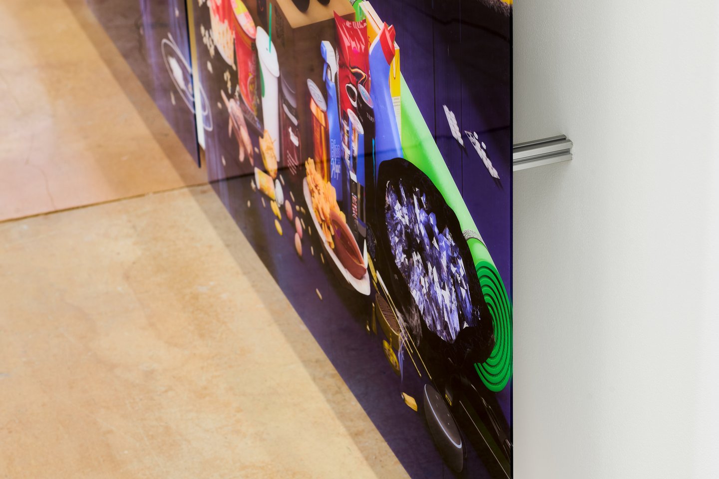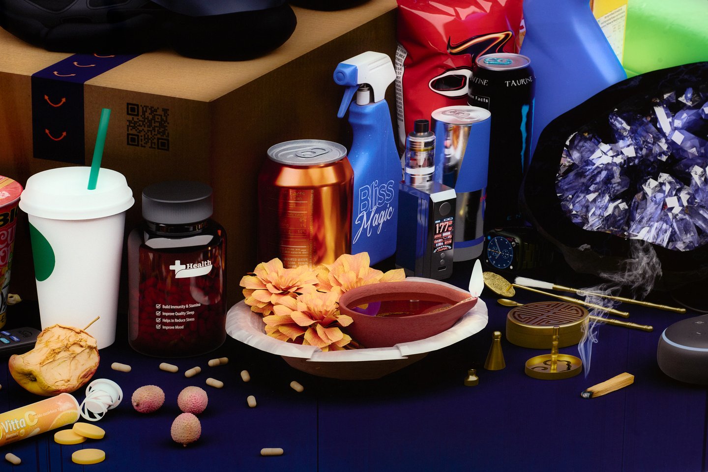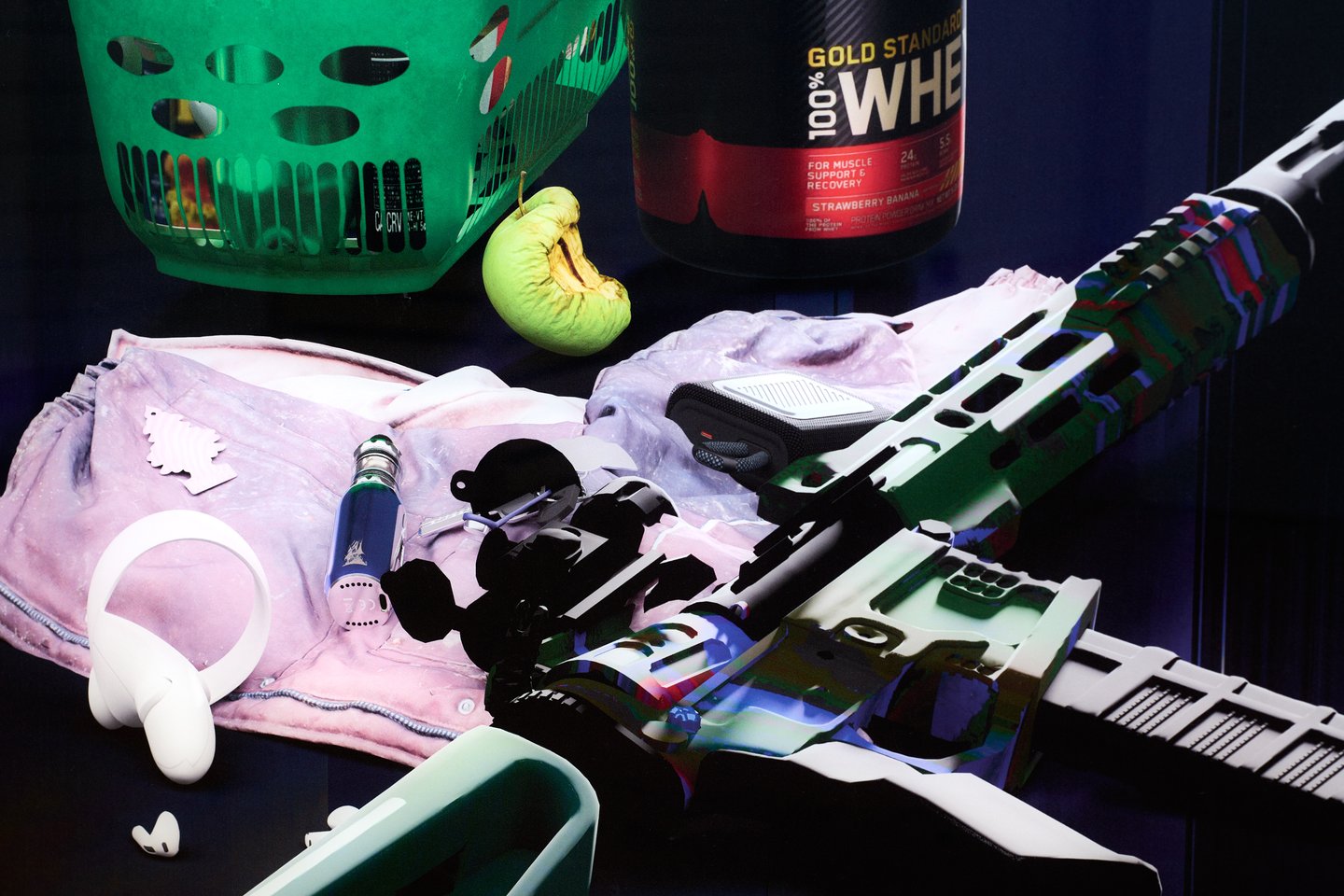 Ergot is a toxic fungus used as a metaphor for digital intoxication. Drawing on psychopolitics, simulacra, and techno-feudalism, this work explores how identity, pleasure, and power are distorted under platform capitalism. It constructs a pixel world of hypermasculine avatars, stylised violence, and dopamine-fuelled objects using AI, CGI, photogrammetry, and glitch. Vapes, crystals, and supplements reflect commodified desire, while dancing police and custom weapons expose gamified violence. Realised as a triptych of three 110×250 cm plexiglass panels, the piece mirrors the seductive toxicity it critiques.