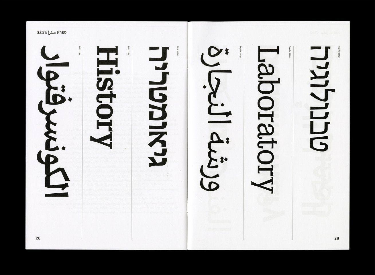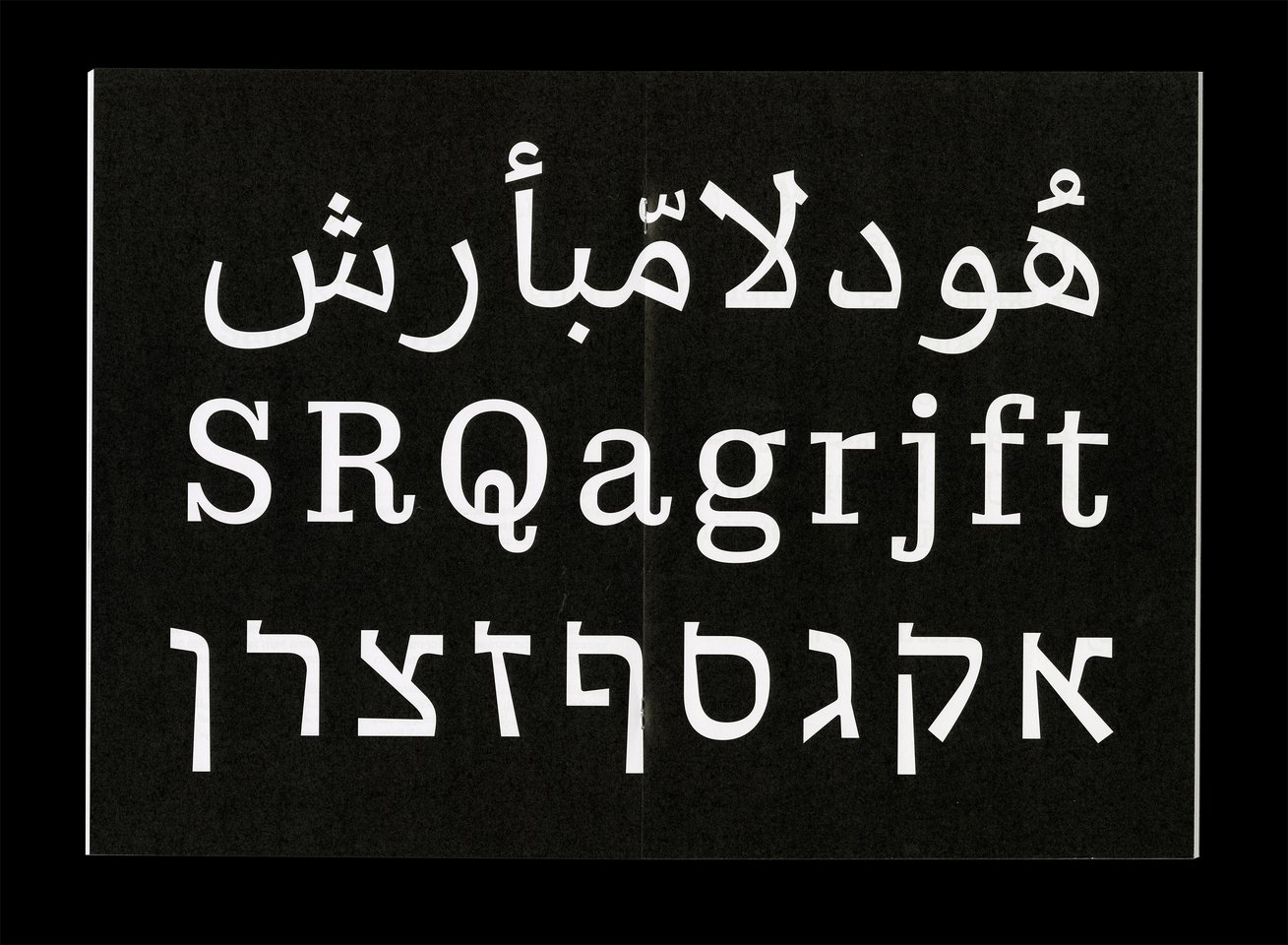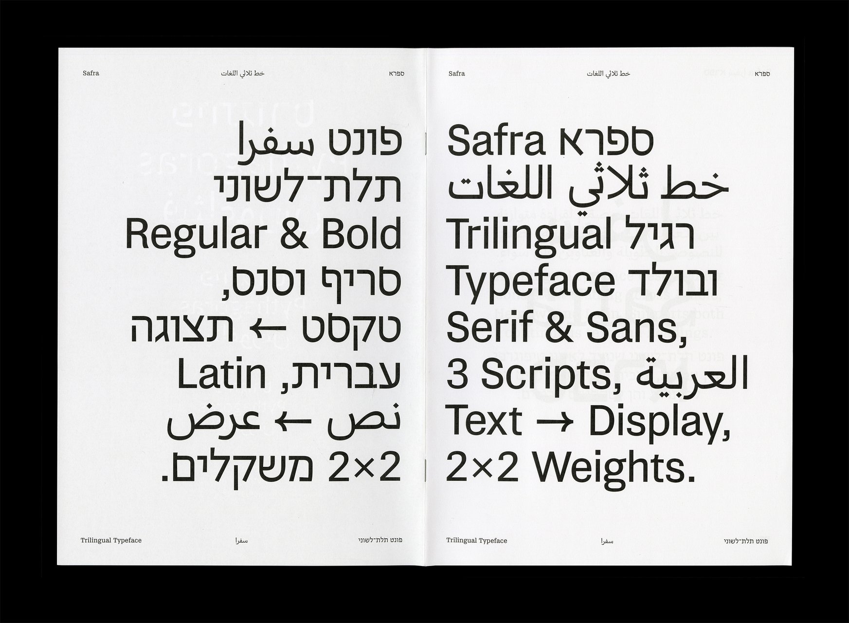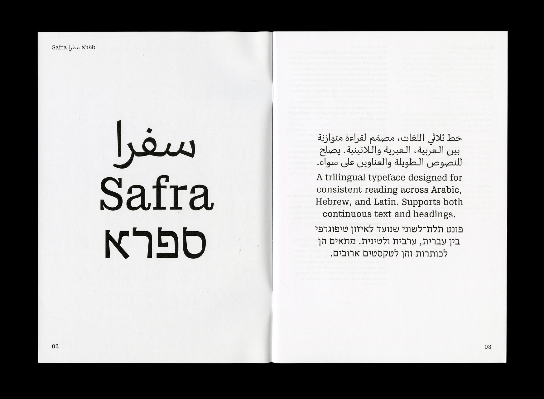 Safra ספרא سفرا est une famille de caractères trilingue comprenant des styles avec et sans empattements. Conçue dans une approche contemporaine à faible contraste, elle prend en charge les écritures hébraïque, arabe et latine, avec une composition typographique claire et cohérente entre les langues. En équilibrant les différences structurelles tout en préservant la voix unique et l’identité de chaque écriture, Safra ספרא سفرا favorise une communication multilingue sans imposer d’uniformité. Le design agit comme un pont entre les systèmes d’écriture, maintenant l’harmonie visuelle et l’intégrité typographique. Elle est adaptée à la lecture prolongée comme à l’affichage dans des contextes culturels, éducatifs et publics.
