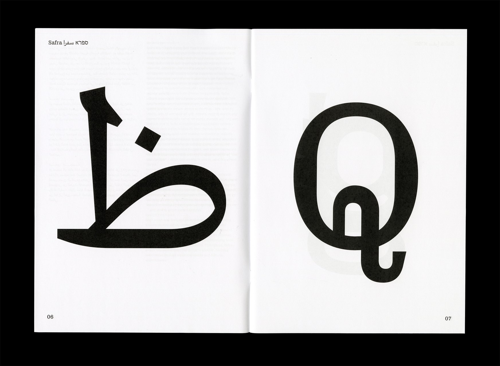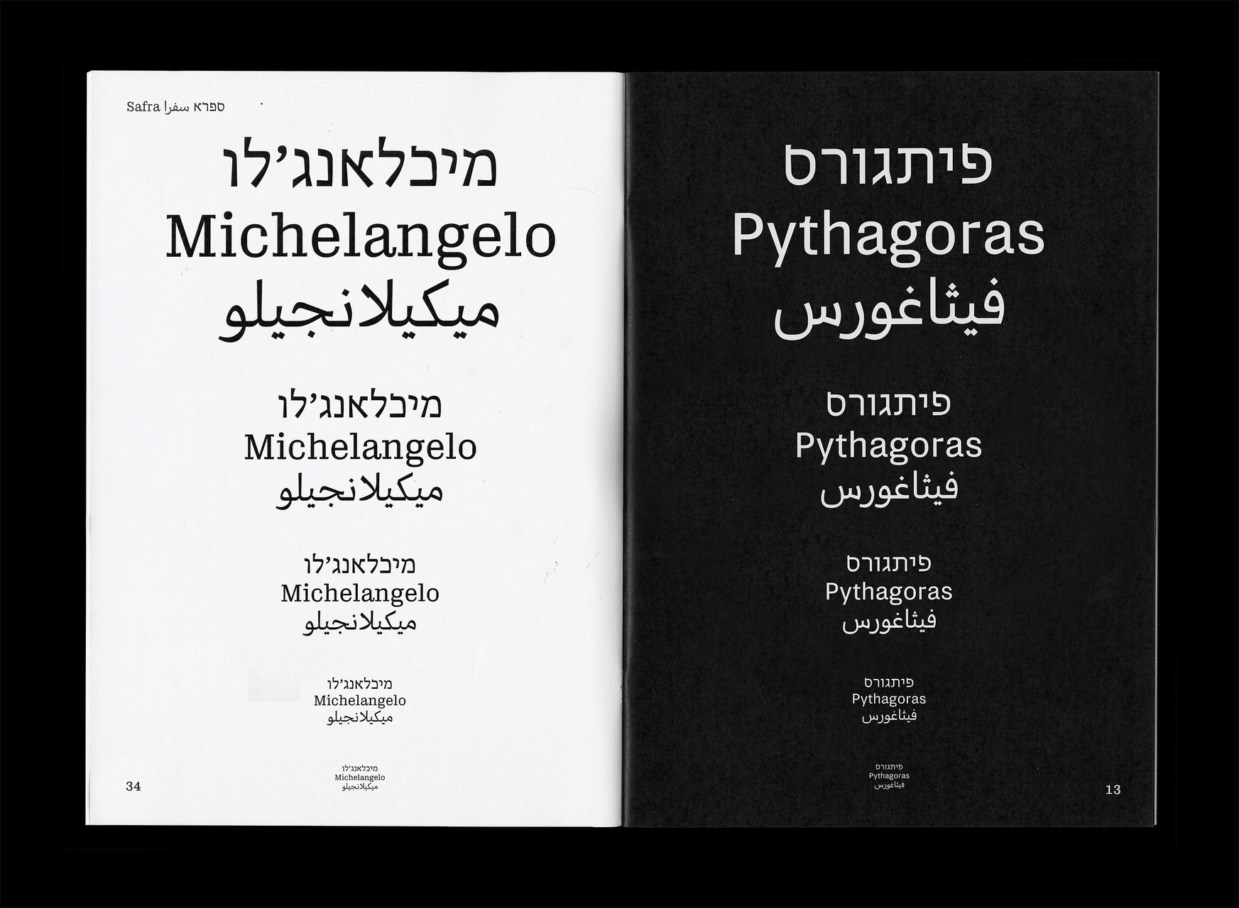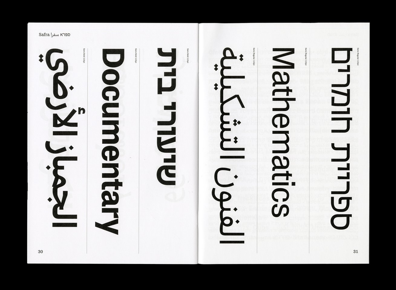 Safra ספרא سفرا est une famille de caractères trilingue comprenant des styles avec et sans empattements. Conçue dans une approche contemporaine à faible contraste, elle prend en charge les écritures hébraïque, arabe et latine, avec une composition typographique claire et cohérente entre les langues. En équilibrant les différences structurelles tout en préservant la voix unique et l’identité de chaque écriture, Safra ספרא سفرا favorise une communication multilingue sans imposer d’uniformité. Le design agit comme un pont entre les systèmes d’écriture, maintenant l’harmonie visuelle et l’intégrité typographique. Elle est adaptée à la lecture prolongée comme à l’affichage dans des contextes culturels, éducatifs et publics.