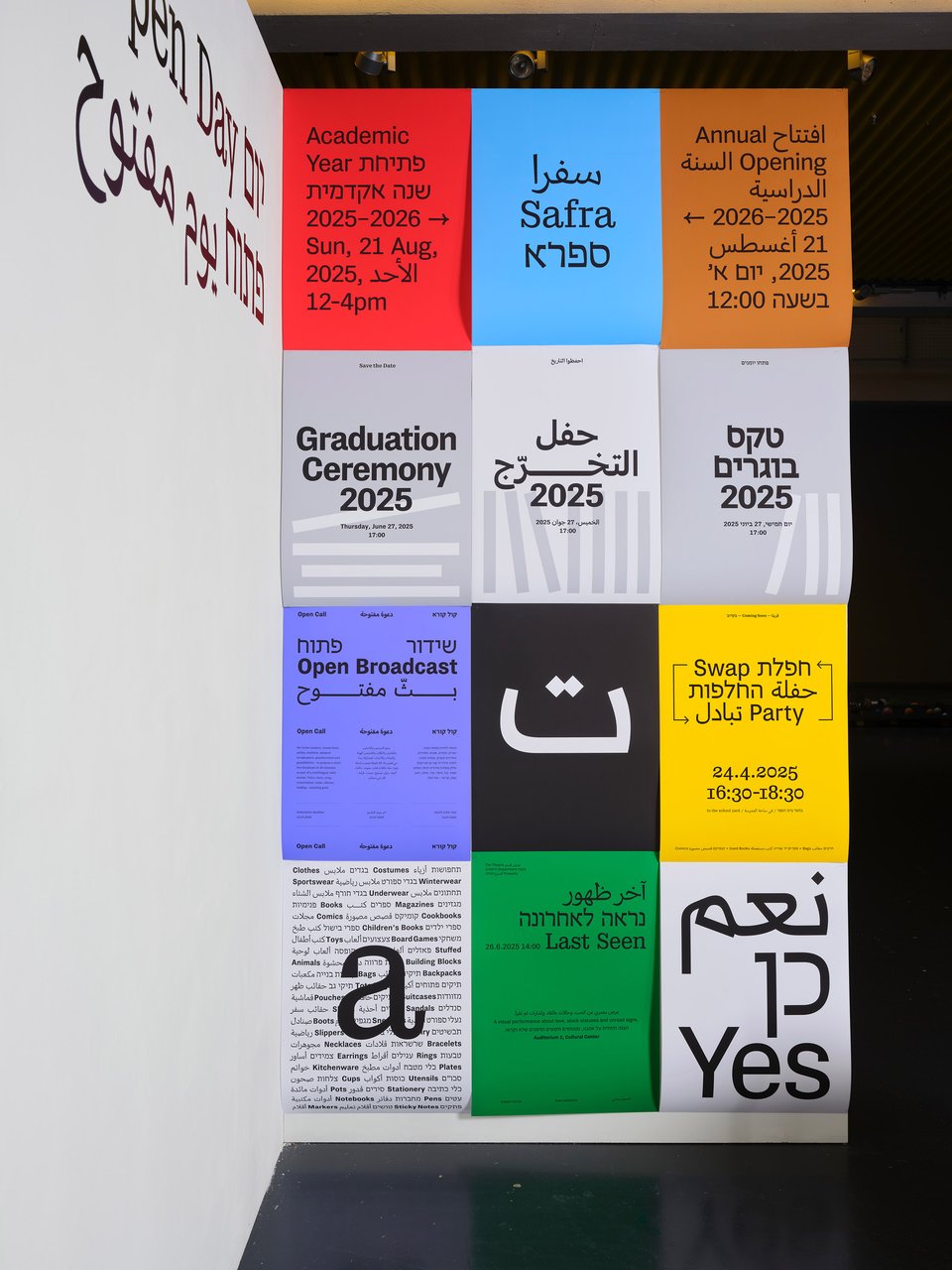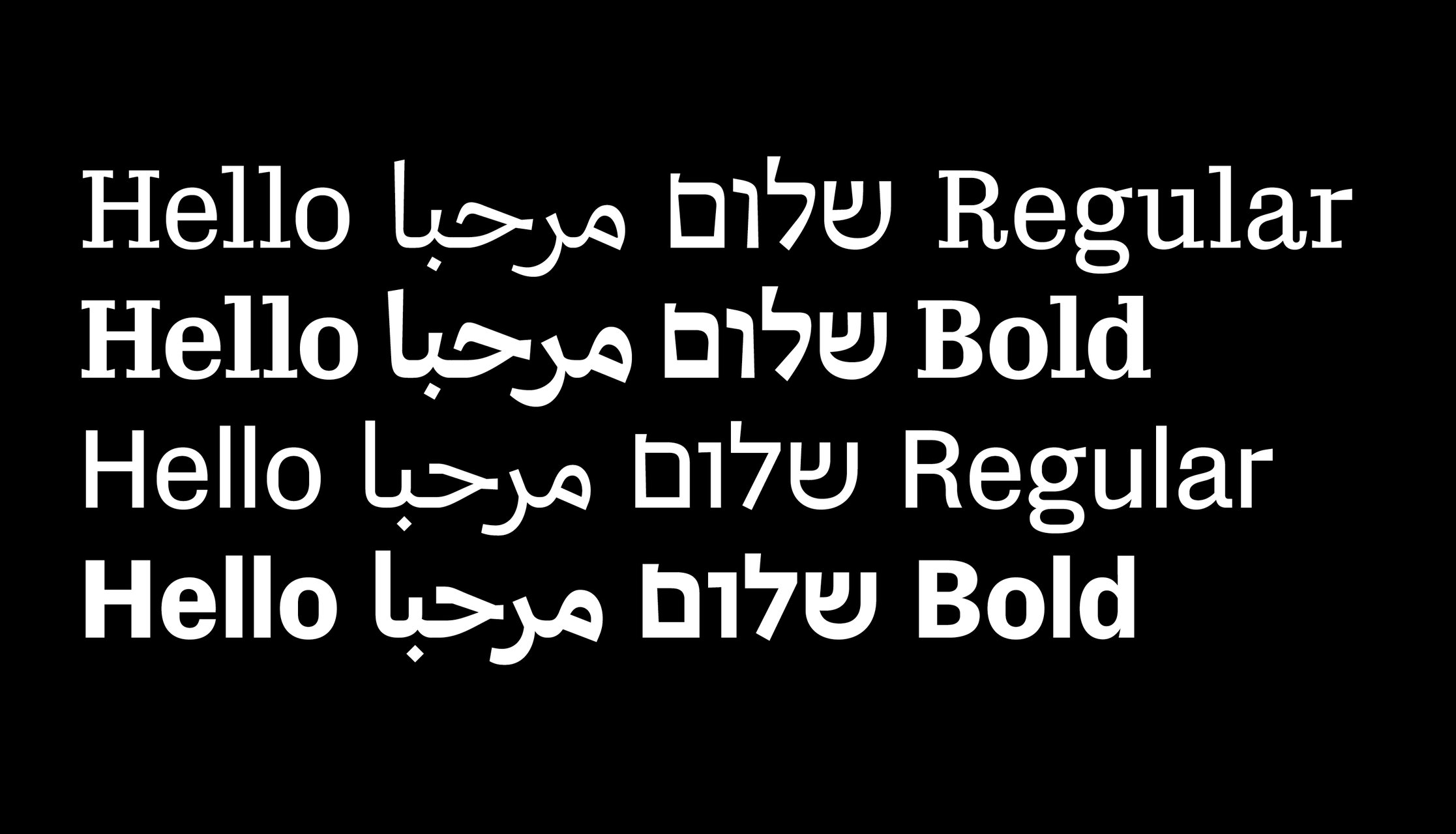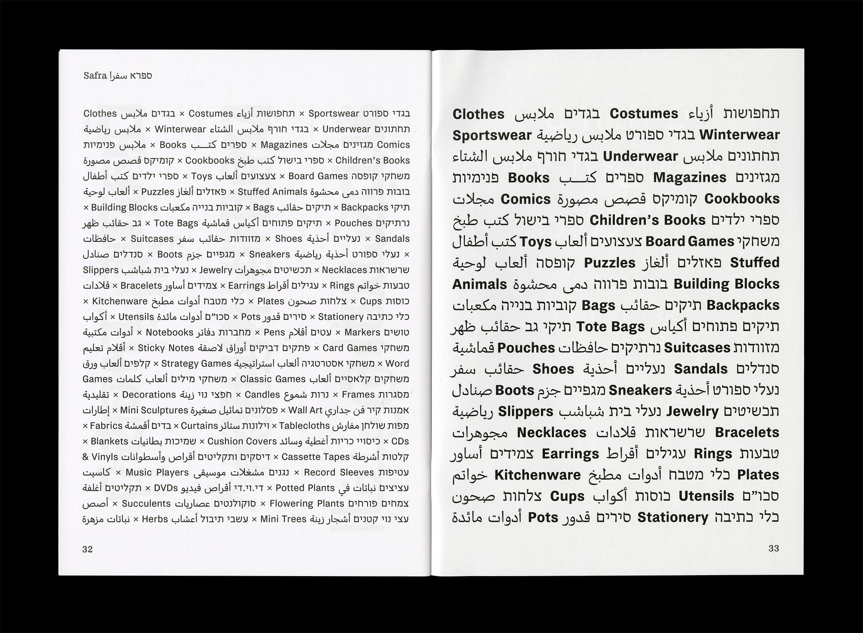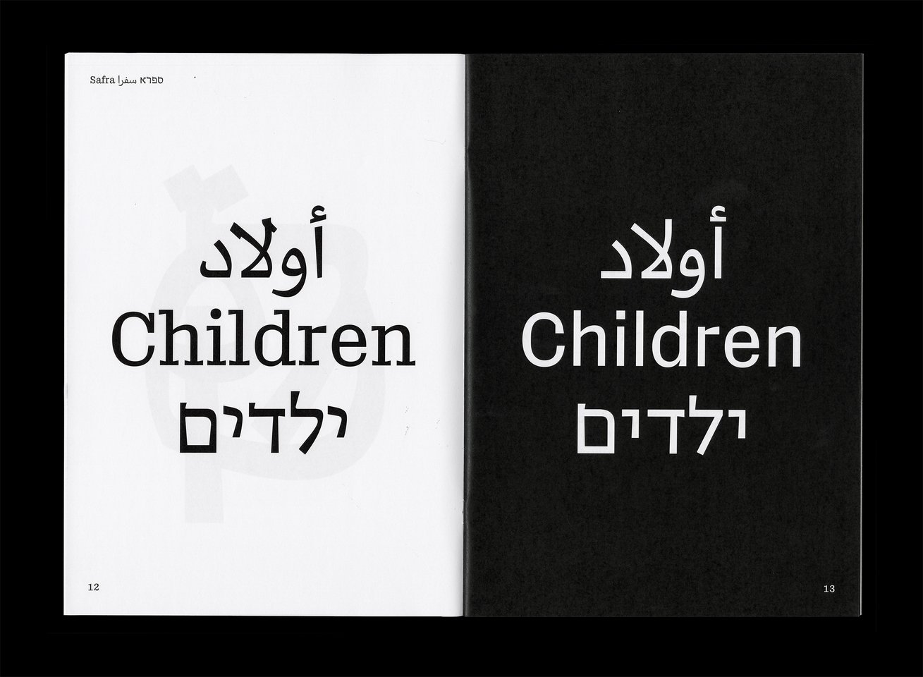 Safra ספרא سفرا est une famille de caractères trilingue comprenant des styles avec et sans empattements. Conçue dans une approche contemporaine à faible contraste, elle prend en charge les écritures hébraïque, arabe et latine, avec une composition typographique claire et cohérente entre les langues. En équilibrant les différences structurelles tout en préservant la voix unique et l’identité de chaque écriture, Safra ספרא سفرا favorise une communication multilingue sans imposer d’uniformité. Le design agit comme un pont entre les systèmes d’écriture, maintenant l’harmonie visuelle et l’intégrité typographique. Elle est adaptée à la lecture prolongée comme à l’affichage dans des contextes culturels, éducatifs et publics.