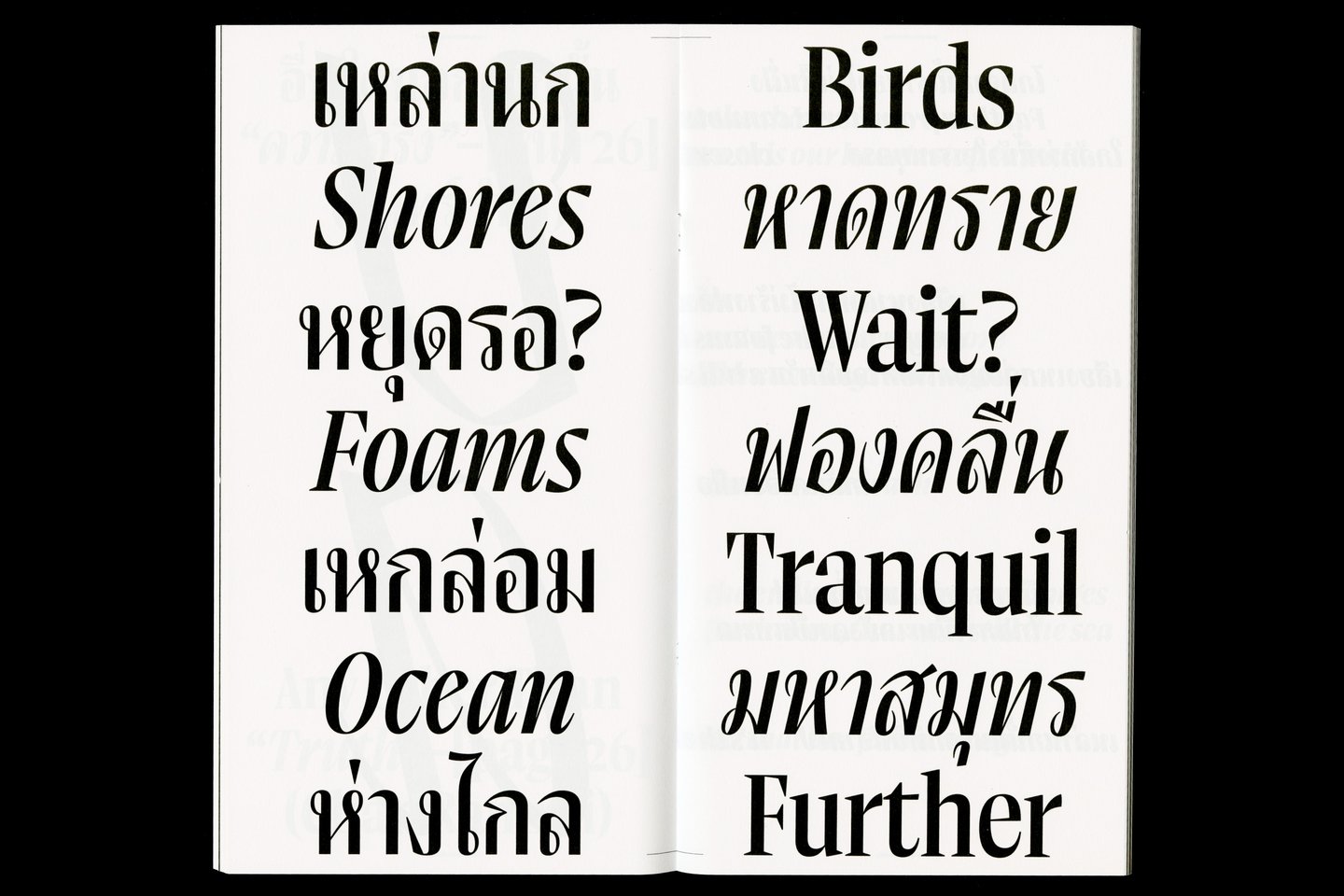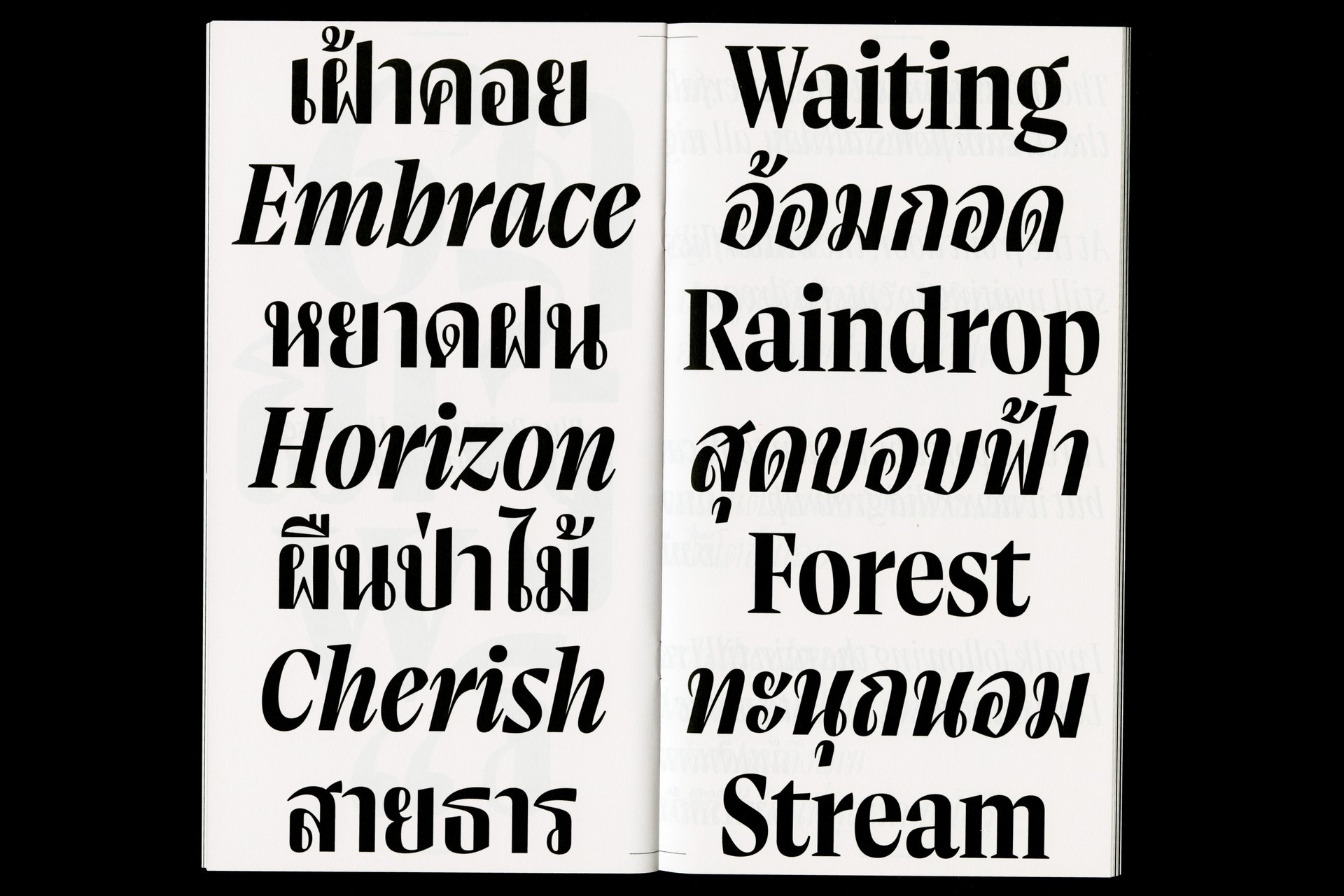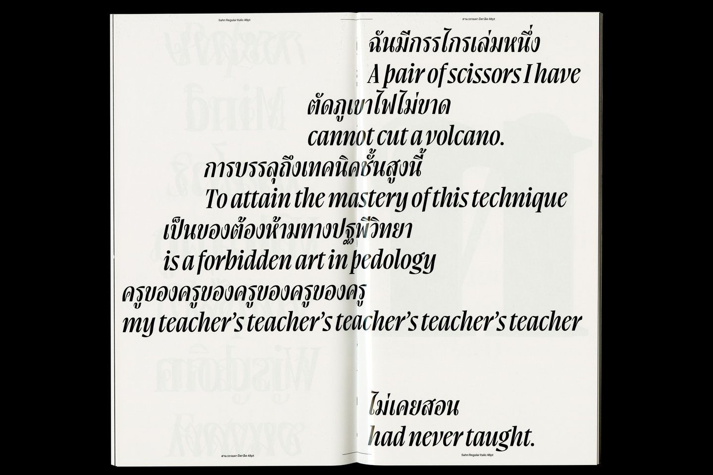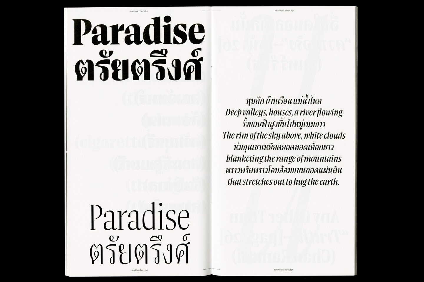Sahn est un caractère typographique à la fois solennel et plein de saveur, conçu pour élargir les possibilités de la famille des caractères typographiques dite «Thai Loop ». Dans ce projet, les écritures thaï et latines ont été développées simultanément. Les caractéristiques de l’une peuvent influencer et s’intégrer à l’autre, créant ainsi un langage visuel cohérent. Bien que l’écriture thaïe semble très différente de l’alphabet latin, les deux partagent un répertoire de formes similaires; disjointes, elles cherchent toutefois des moments de connexion. Sahn vise à encourager un dialogue entre ces deux écritures en mettant en valeur leurs caractéristiques communes, leur ton et leur texture, tout en respectant leurs différences culturelles uniques.