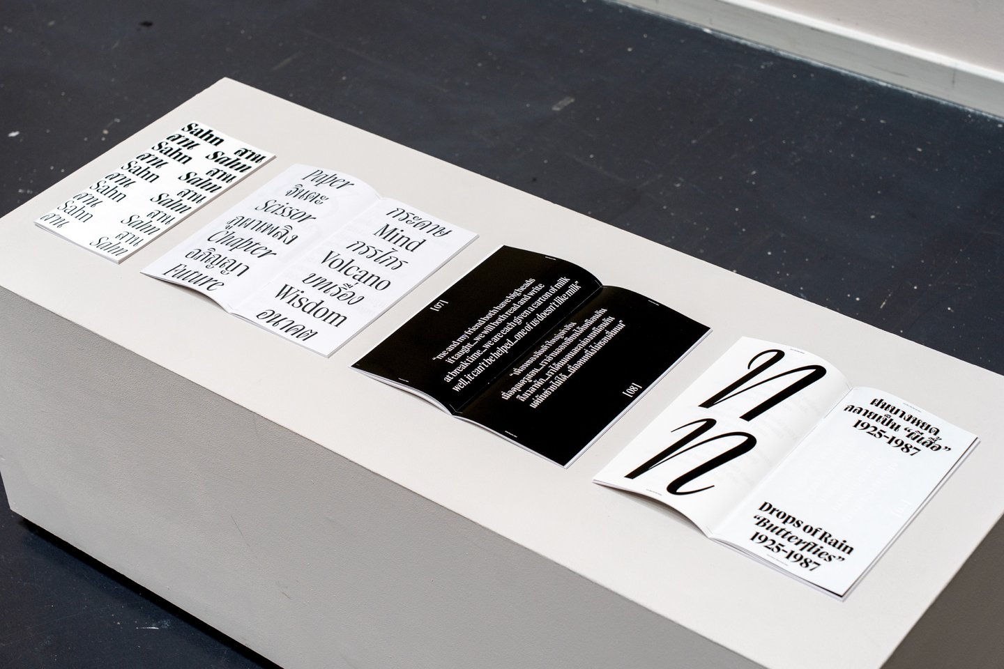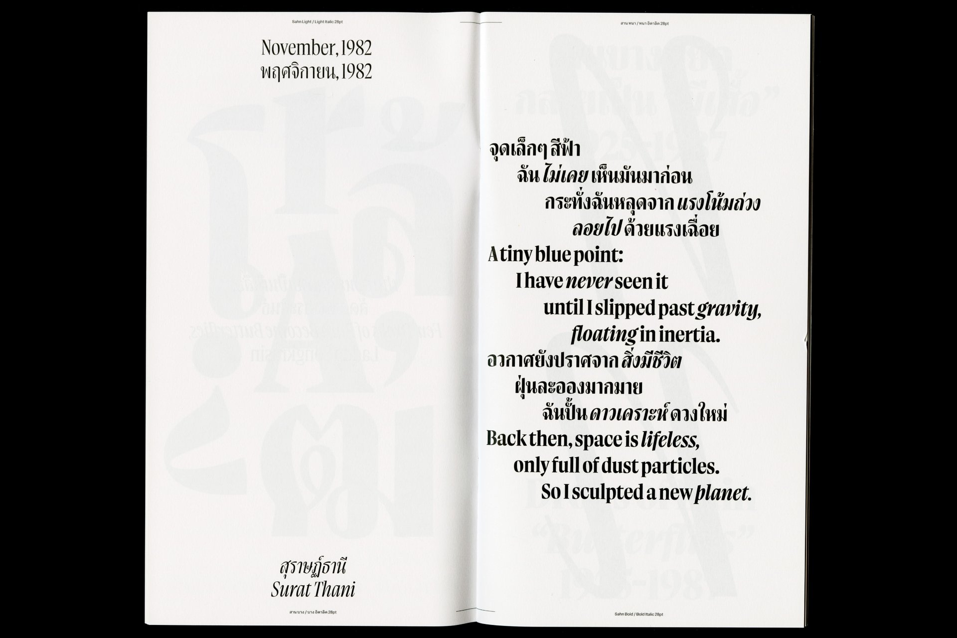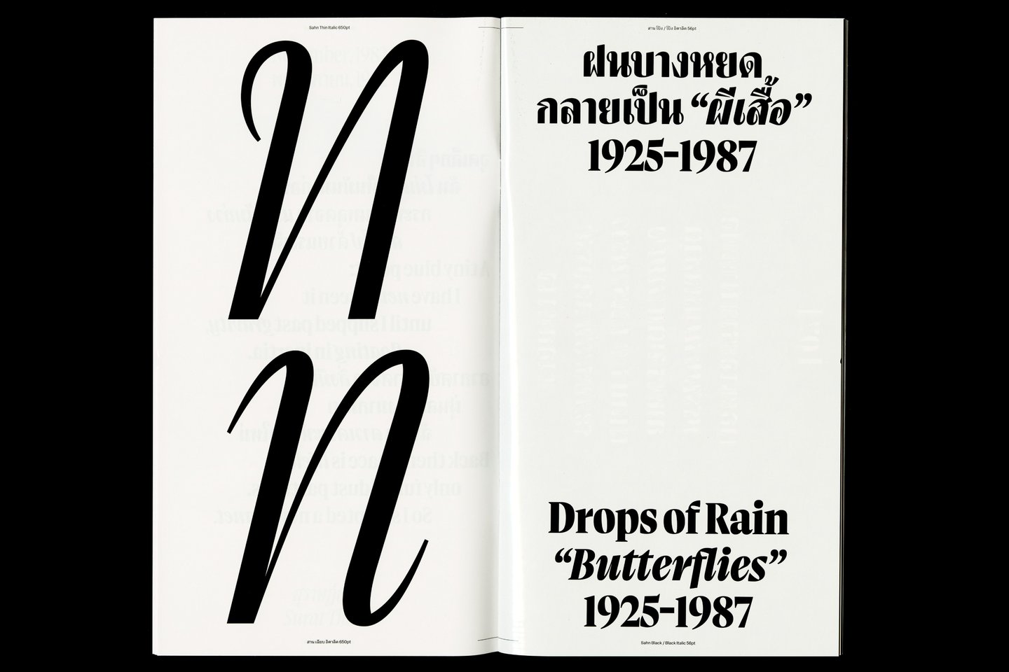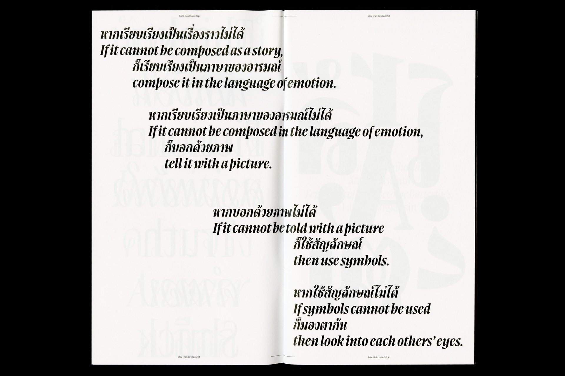 Sahn est un caractère typographique à la fois solennel et plein de saveur, conçu pour élargir les possibilités de la famille des caractères typographiques dite «Thai Loop ». Dans ce projet, les écritures thaï et latines ont été développées simultanément. Les caractéristiques de l’une peuvent influencer et s’intégrer à l’autre, créant ainsi un langage visuel cohérent. Bien que l’écriture thaïe semble très différente de l’alphabet latin, les deux partagent un répertoire de formes similaires; disjointes, elles cherchent toutefois des moments de connexion. Sahn vise à encourager un dialogue entre ces deux écritures en mettant en valeur leurs caractéristiques communes, leur ton et leur texture, tout en respectant leurs différences culturelles uniques.